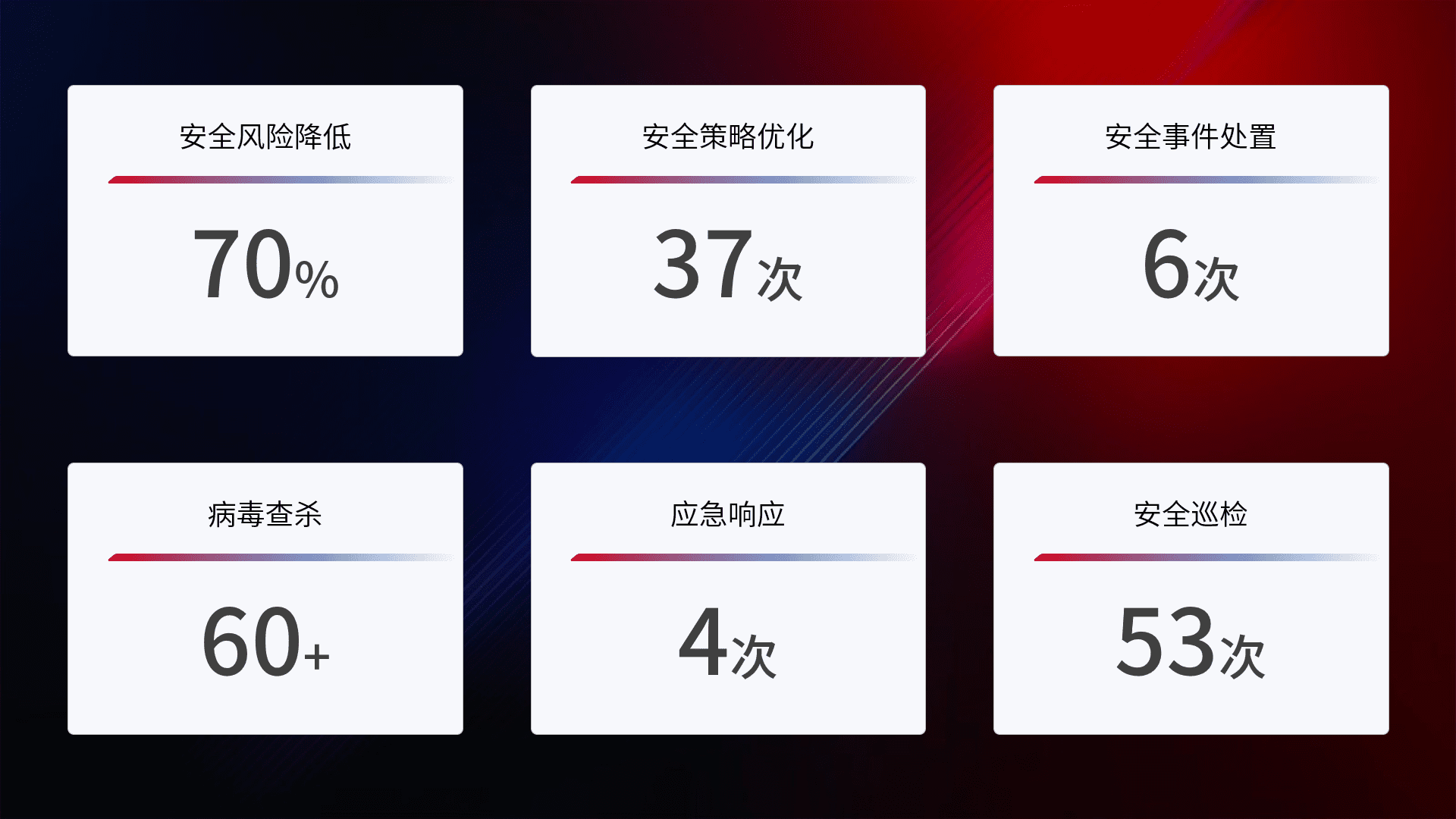 提供全面的安全事件报告体系,,,,包括处置报告、、、、周报、、、季度和年度总结,,结合持续监控,,,帮助客户深入了解网络安全状况。。。