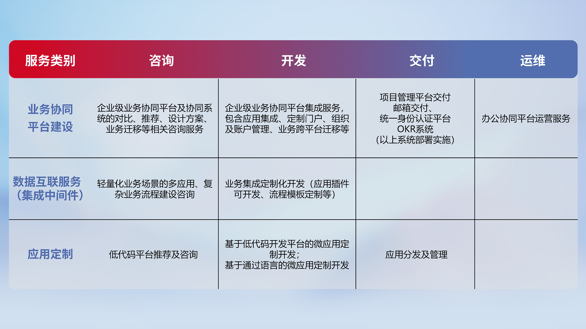 针对钉钉、、企微、、、、IDaas等平台级产品提供产品的规划、、、方案、、交付、、定制化开发等服务,,实现如统一协同办公、、、智能客户服务、、、、混合会议管理、、智能数据查询、、、、等业务场景,,实现数字化转型。。。。
